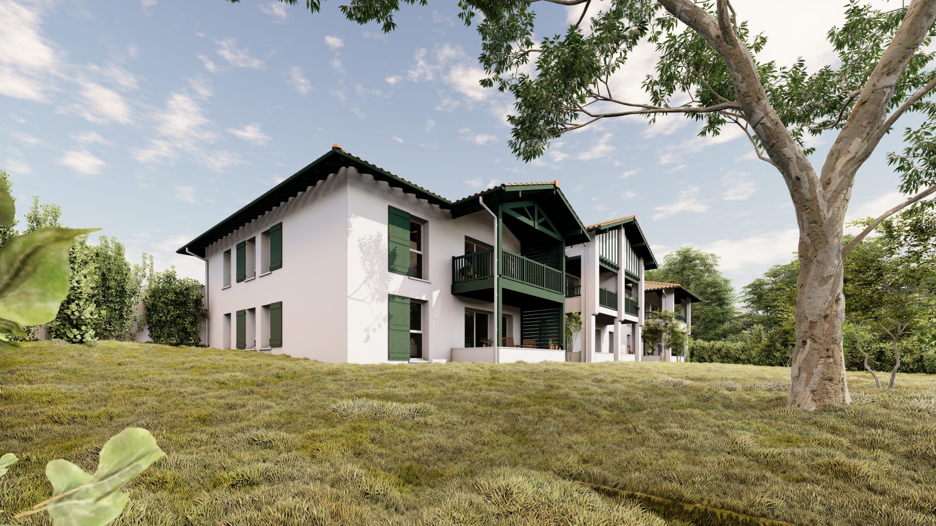 Cette petite résidence à taille humaine en R+1 comprend 7 appartements seulement, offrant un cadre de vie serein et intimiste. Le projet séduit par son architecture d’inspiration néo-basque, aux menuiseries et tonalités vertes et blanches, parfaitement en harmonie avec l’environnement naturel.
